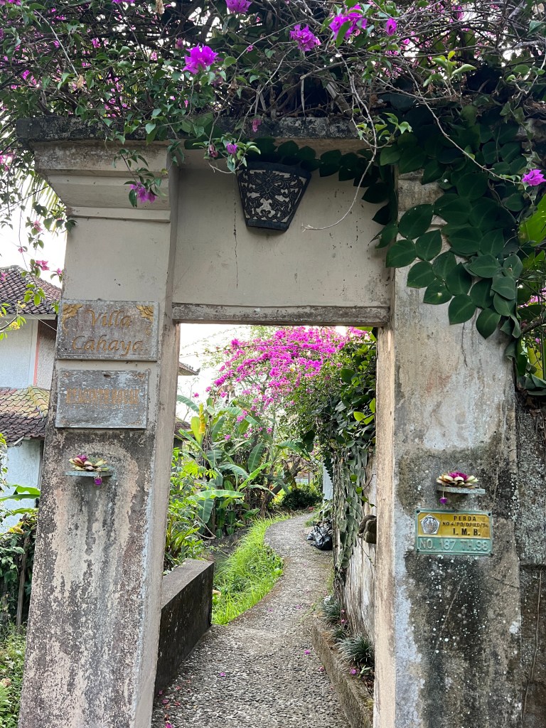 Sometimes my path would cross with that of other travelers. Are they on their way to yoga? Where are they from? I would nod and smile and move on and pass some villas, some had beautiful fuchsia bougainvillaea hanging over the doorway. I would pause and take them in, they were exactly like the ones we had, which were used for Wayan’s offerings, but draped over the arched doorway, they were different here.